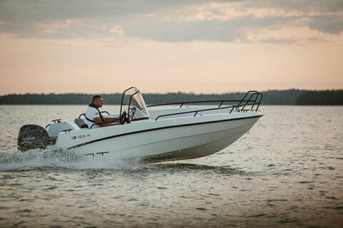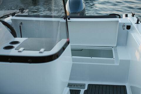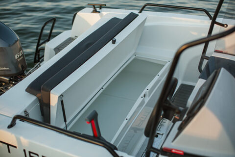 AMT 165 R och Rf är klassens rymligaste båtar. Den öppna layouten gör att det är enkelt att röra sej i båten, samtidigt finns det också bra med stuvutrymme. Fast bränsletank och batteriets placering framför styrkonsolen gör att stuvutrymmet under bakbänken är enormt. Här ryms t.ex. alla båtens dynor och utan att de behöver vikas.